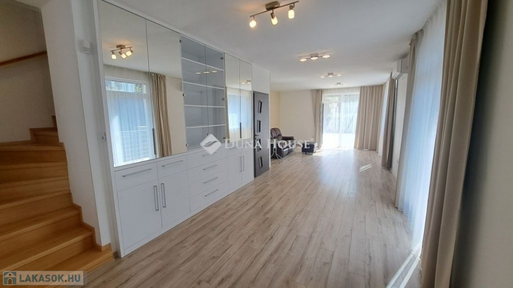 Maga az ingatlan belső kétszintes: a földszinten található hatalmas élettér ad otthont a konyhának és hozzá tartozó tárolónak, étkezőnek, mosdónak, valamint a közvetlen terasz és kertkapcsolatos nappalinak. Tökéletes teret nyújt majd a helyiség Önnek és családjának egész évben. Igény esetén kialakítható még itt egy kandalló is, a tökéletes őszi-téli hangulat megteremtéséhez.