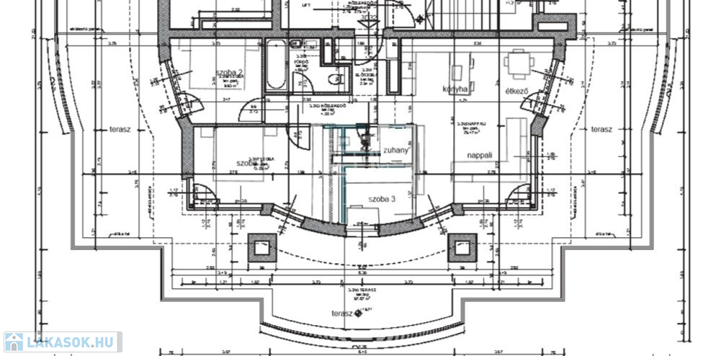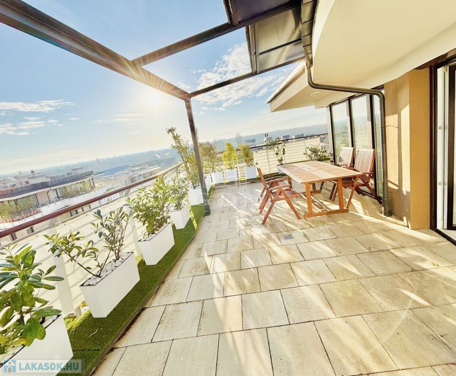 A 72 m²-es, nappali + 3 szobás lakás kifinomult belső tereit egyedülálló, 87 m²-es körpanorámás terasz egészíti ki, amelyről lenyűgöző 180 fokos kilátás tárul eléd: a Budai Vár, Gellért-hegy, Megyeri-híd és a MOL torony mind egyetlen pillantással belátható. A teraszt zöld növényzet és árnyat adó fasor öleli körbe, garantálva az intimitást és nyugalmat – mindezt egy nyitható pergolával, stílusos kerti bútorokkal és természetközeli hangulattal.