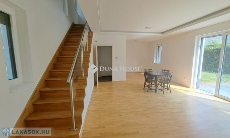 Földszint tágas nappali, modern konyha, közvetlen kertkapcsolat, ideális családi és baráti együttlétekhez.