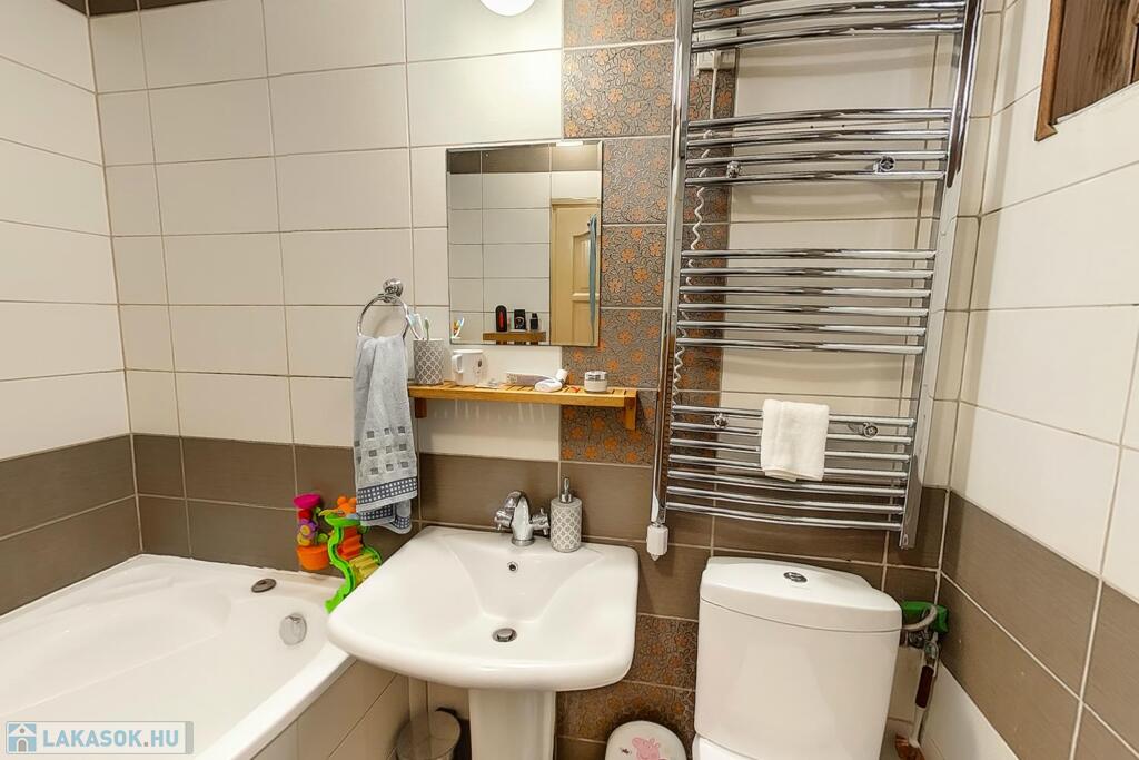 A közelmúltban felújítása megtörtént ami a vezetékek cseréjét is magába foglalta. A fürdőszoba tágas, modern burkolatokkal, szaniterekkel felszerelve.