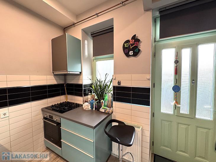 A világos, ablakos konyhába új konyhabútorok kerültek beépítésre, valamint beépített villanytűzhellyel és mosogatógéppel rendelkezik.