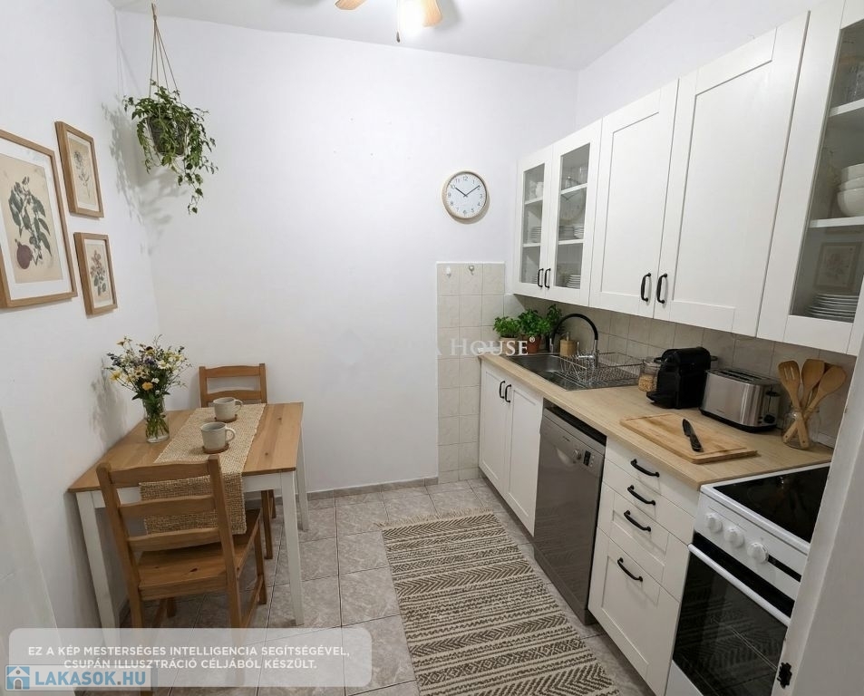 A berendezett helyiségek képei illusztrációk, a lakás jelenleg bútorozatlan, kivétel a konyhabútor, ami a vételár részét képezi.