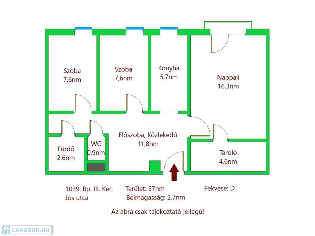 Eladó Budapest III.ker. Jós utcában - Békásmegyer Duna felőli oldalán - rendezett, jó lakóközösségű, liftes, átlagos állapotú ház V. emeletén, egy 57 nm-es, 1+2 szobás (külön nyílóak), franciaerkélyes, világos, tehermentes, pár éve felújított lakás, beépített bútorokkal.