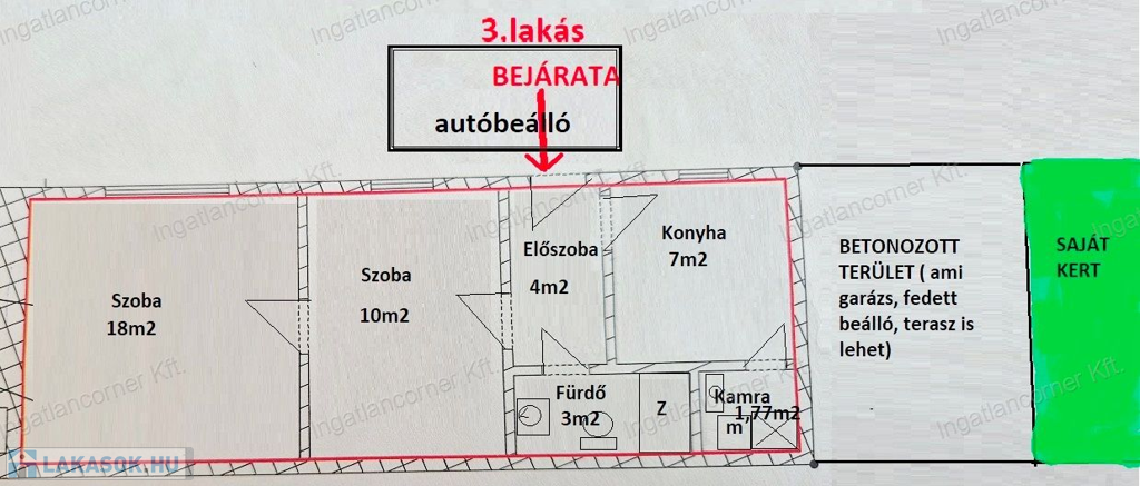 A lakótéren túl egy kb.30m2-es betonozott terület érhető el, ami a lakáshoz tartozó terület a ház oldalában, ami TERASZNAK vagy akár 2 autó számára, FEDETT GÉKOCSIBEÁLLÓKÉNT is használható, továbbá kb.20m2-es SAJÁT FÜVESÍTETT KERT tartozik a lakáshoz!