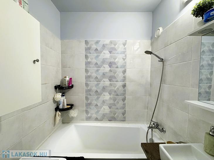 A fürdőszoba új burkolatot kapott és új akrilkáddal rendelkezik. A mosógép ebben a helyiségben kapott ki- és beállást, a WC egy külön helyiségben található.