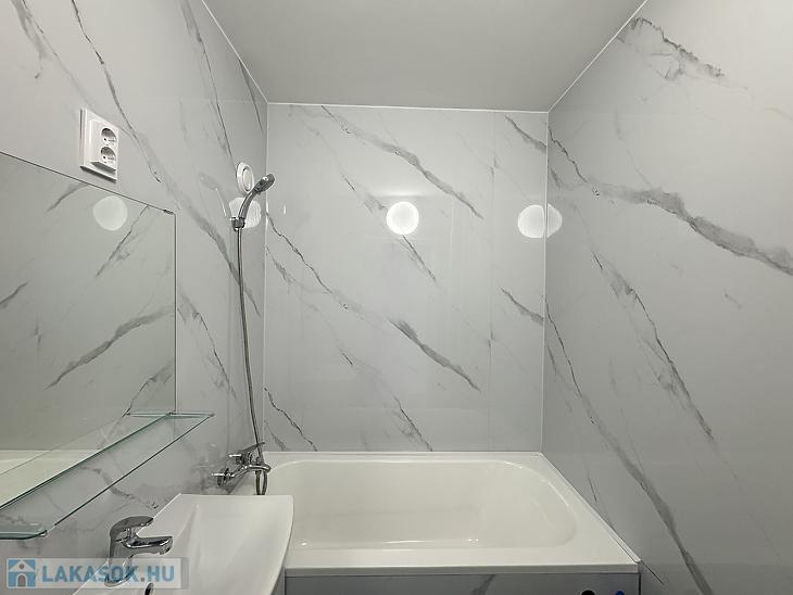 A fürdőszoba új burkolatot kapott és új akrilkáddal rendelkezik. A mosógép ebben a helyiségben kapott ki- és beállást, a WC egy külön helyiségben található.