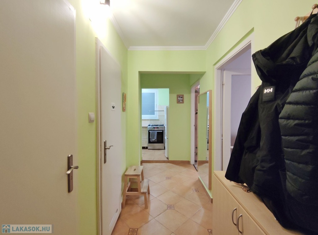 A több ponton záródó jó minőségű biztonsági bejárati ajtón keresztül a teljesen felújított és szépen karbantartott állapotú, a külön nyíló szobák elrendezését tekintve jó elosztású, délkeleti tájolású klimatizált lakásba érkezünk. A bejárattól szemben a közlekedő végében találjuk a konyhát a kamrával, bal oldalon a vizes helyiségek, a bejárati ajtó mellett balra a gardrób, jobb oldalon pedig a szobák nyílnak meg. A kerámia burkolatú előszobában közvetlenül jobb kéz felől járólap burkolatú, tágas, világos, parkra néző, 18 nm-es, műanyag ablakos, redőnyös, új, minőségi LG márkájú klímával szerelt nappaliba jutunk. A közlekedőben közvetlenül a nappali mellett jobbra nyílik a másik, szintén 18 nm-es, minőségi parketta burkolatú hálószoba. A szobából kilépve a közlekedő végében juthatunk a járólapos, lihthofos (világítóablak) szúnyoghálós ablakos, gépesített, 4 gázlángos és elektromos, légkeveréses sűtős tűzhellyel felszerelt, mosogatóval is beépített konyhába. A konyhából visszafelé haladva, jobbra találjuk a külön nyíló, járólappal és csempével burkolt, 2,4 nm-es fürdőszobát, mellette pedig a szintén minden elemében felújított, járólapos toalettet.
