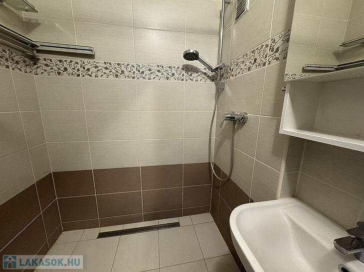 A fürdőszobában épített zuhanyzó található, amely modern, letisztult megjelenést kölcsönöz a térnek.
