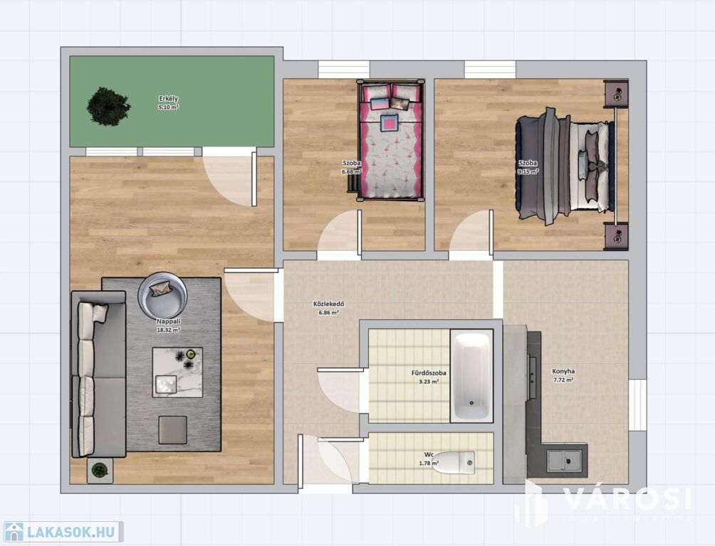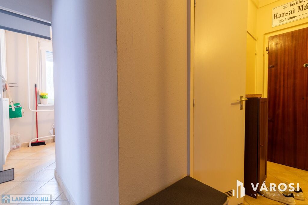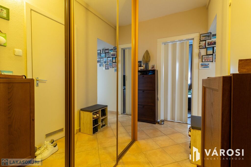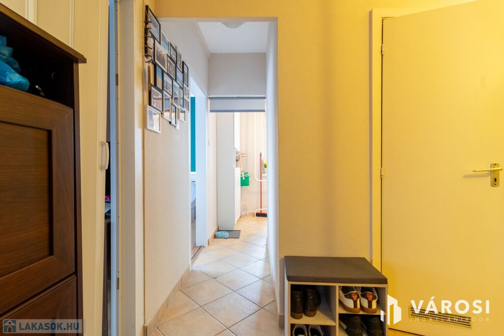 A lakás világos, praktikus elosztású: a szobákban laminált padló, míg a közlekedőben, konyhában, fürdőben és WC-ben hidegburkolat található.
