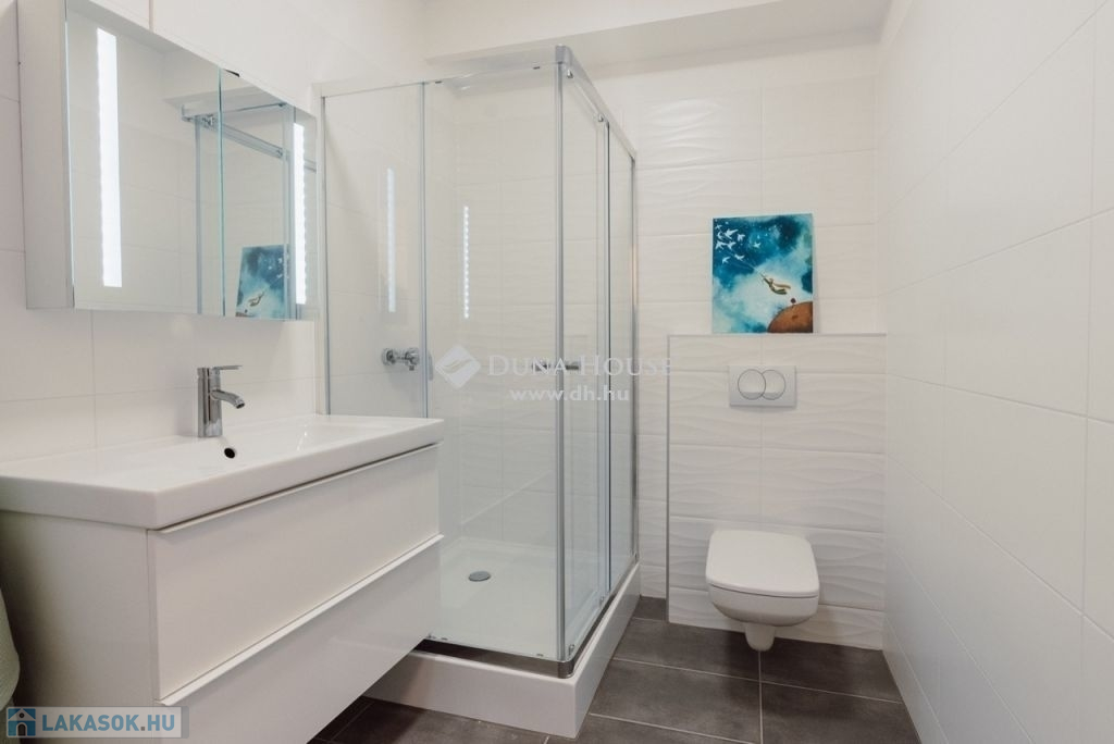 FÜRDŐSZOBA: A fürdőszobában zuhanyzó, WC, led világítással ellátott kinyitható tükrös szekrény, fiókos mosdó alatti szekrény, valamint a mosó- és szárítógép található.