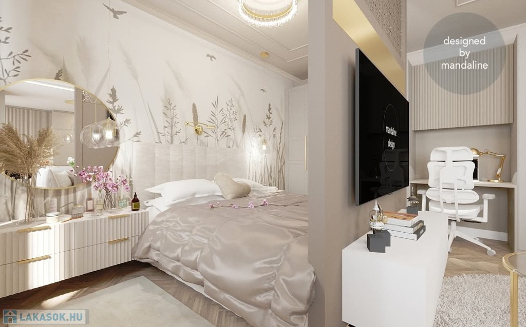 A lakás hangulata az első pillanattól magával ragad: a letisztult színek, az egységes burkolatok, az ízlésesen kiválasztott csillárok és világítótestek, a finoman megválasztott függönyök, a beépített és szabadon álló bútorok együttese valódi otthonérzetet teremt.