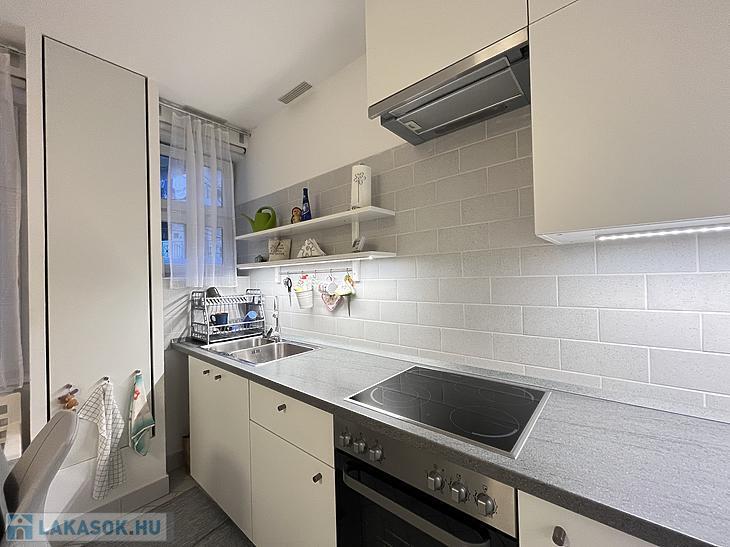 A konyha új bútorzatot kapott, étkezővel rendelkezik. A mosógép ki-és beállása ebben a helyiségben került kialakításra.