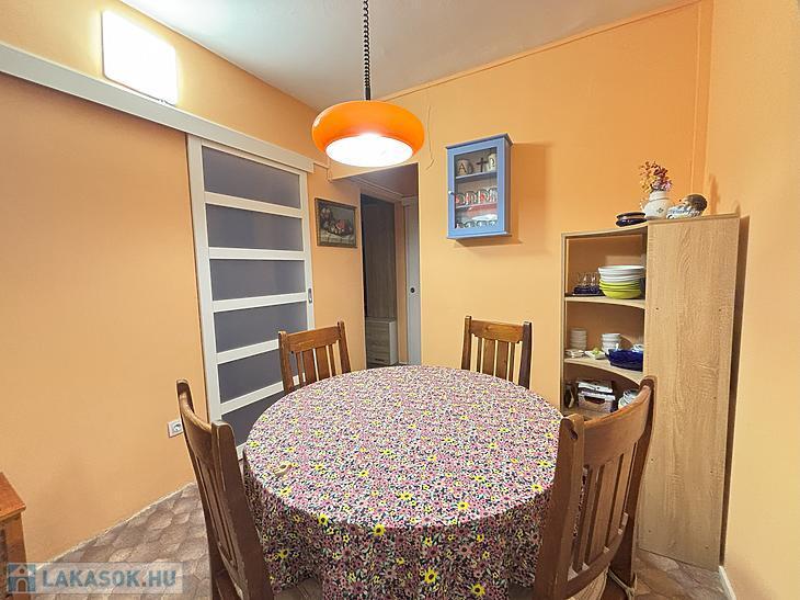 A falak simára festettek, a bal oldali hátsó szoba tapétás, ami külön hangulatot ad neki. Az étkező tágas, ideális helyet kínál a közös étkezéseknek és a családi beszélgetéseknek.