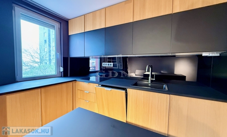 A nappali és a konyha egy légtérben kapott helyet, mégsem zsúfolt. A teljes falon futó konyhabútor, a nagy munkafelület és a szigetes kialakítás jól használható, mindennapi életteret ad. Innen közvetlenül elérhető az erkély, ami kényelmesen használható – akár egy gyors reggelihez, akár egy esti leüléshez.