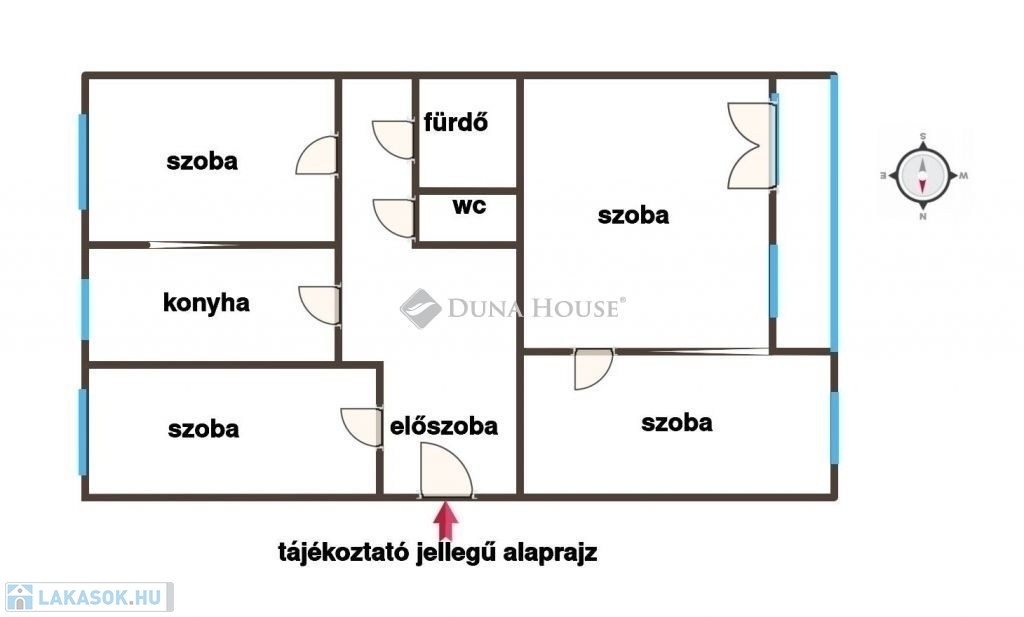 Tájolás: K és NY, Két szoba és a konyha ablakai keletre, míg a másik két szoba és az erkély ablakai nyugatra néznek.