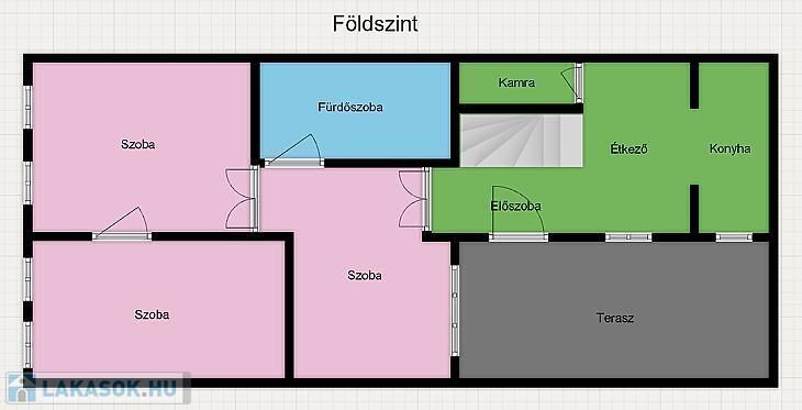 A földszinten 3 szoba, fürdőszoba, konyha, tágas étkező és kamra található.