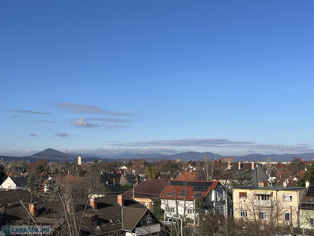 Az 55 m²-es terasz az év nagy részében túlzás nélkül valódi élettérként működik. Viszonylag intim, az utcáról nem látni fel rá, a szomszéd házak kellő távolságban vannak. A délelőtti nap a konyha felőli oldalra süt, a délutáni a szobák elé — évszaktól függően jól variálható a terasz használata. A kilátás igazán szép, a szobák felöli oldalon a kertvárosra és a Budai hegyekre látunk rá meglepően messzire. A kedvencünk pedig a terasz előtti nagy fa, aminek a lobkoronáját látjuk a szobákból is. Tettem fel a teraszról képeket a tavaszi időszakból is, az aktuális képek mellett.