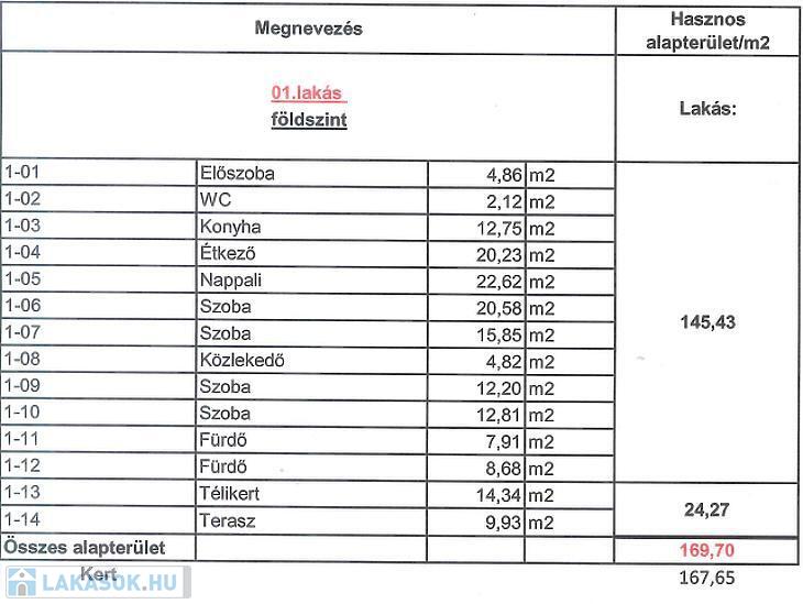 1. lakás: földszinten található nettó: 145,43nm-es (bruttó 169,7nm) amerikai konyhás nappali+ 4 hálószobás lakás. Az ingatlanhoz tartozik egy 14,34nm-es télikert, egy 9,93nm-es terasz és egy saját használatú kert ami 167,65nm.