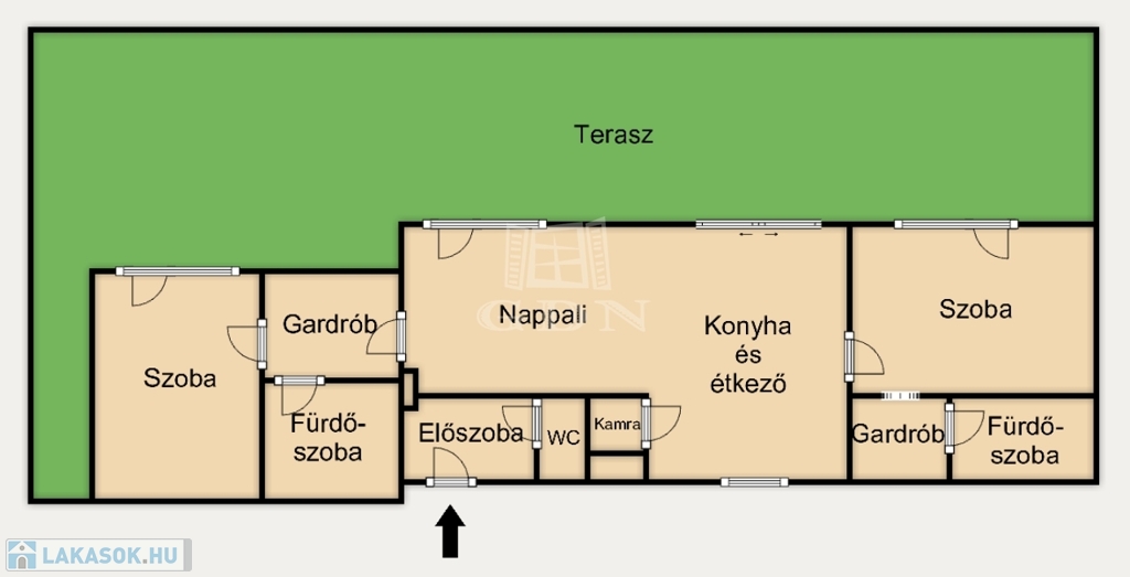 -Két hálószoba a lakás két végében, teljes szeparációval