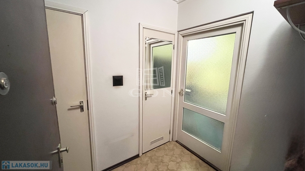 Az előszobából külön nyílik a fürdőszoba és a WC, itt kapott helyet egy beépített gardróbszekrény is. A tágas, padlószőnyeggel burkolt szobából nyílik a konyha, amely ablakos, konyhabútorral felszerelt.