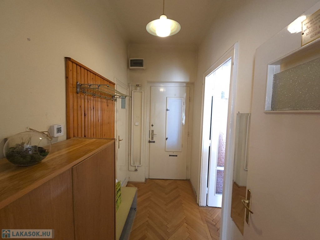 Ahogy belépünk a lakásba, egy tágas előszobába érkezünk, innen balra található a világos szoba, amely dupla rétegű fa nyílászárókkal, redőnnyel felszerelt, és egy hangulatos franciaerkély is kapcsolódik hozzá. Szemben helyezkedik el a fürdőszoba WC-vel , zuhanyzóval, míg jobbra fordulva jutunk el a konyhába, ahol szintén fa nyílászáró található. A konyhából nyílik a praktikus kamra. A lakáshoz tartozik még egy 6 nm-es saját pince, valamint egy 1 autó számára alkalmas garázs is.