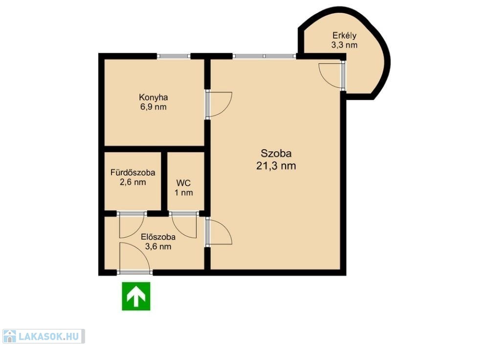 Rendezett, tiszta lépcsőházból a több ponton záródó biztonsági záras bejárati ajtón keresztül lehet bejutni. Egy nagyon tágas 3,6 nm-es előszobába ahol balra egy teljes falat elfoglaló gardrób szekrény teszi lehetővé a bőséges tárolást. Szemben találjuk 2,6 nm-es kádas fürdőszobát. Mellette a külön helységben nyíló 1 nm-es toalettet. Jobbra továbbhaladva tárul elénk a tágas 21,3 nm-es világos, klímával felszerelt nappali ahonnan a 3,3 nm-es egyediséget sugalló félkör alakú fedett erkélyre léphetünk ki. Itt reggelente a friss levegőn kávézhatunk és gyönyörködhetünk az elénk táruló panorámában. A szobából balra a 6,9 nm-es étkező sarkos, ablakos, bútorozott, tágas konyhában találjuk magunkat ahol kényelmesen lehet főzni, étkezni.