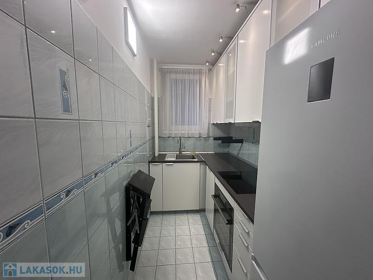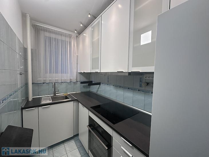Konyhája ablakos, világos. A beépített bútorzat és a gépesítés a vételár részét képezi.