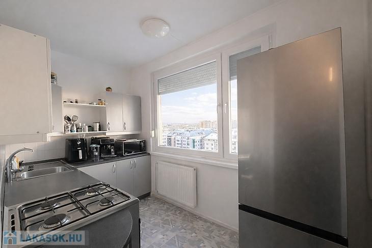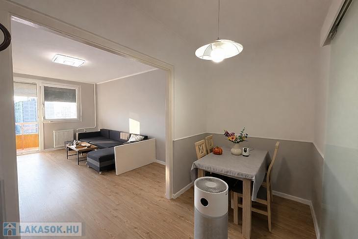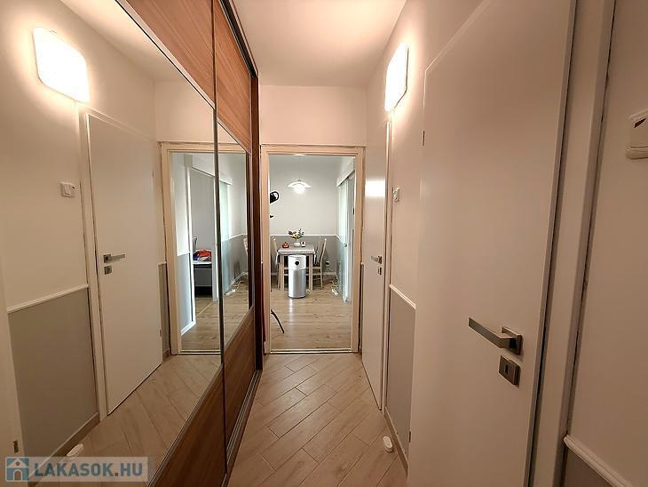 A lakásba több ponton záródó, biztonsági bejárati ajtót, modern beltéri ajtókat, valamint redőnnyel és szúnyoghálóval felszerelt, műanyag keretes, thermo üveges nyílászárókat építettek be. A szobákban laminált padlót helyeztek le, a többi helyiséget járólappal burkolták. A fűtőtesteket korszerűsítése is megtörtént, ezeket egyedi hőmennyiségmérővel látták el. Az elszámolás fogyasztás alapján is történhet, a jelenlegi átalánydíj 7.473.- Ft. Konyhája nagy ablakos, világos, a konyhabútor és a két gardróbszekrény a vételár részét képezi.