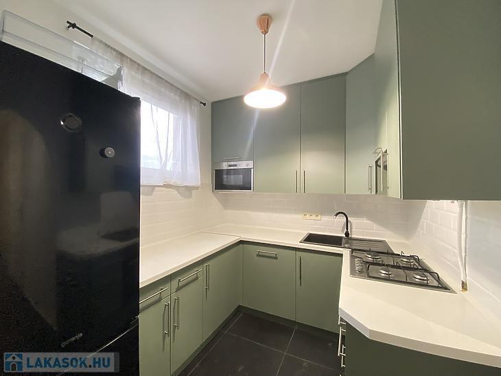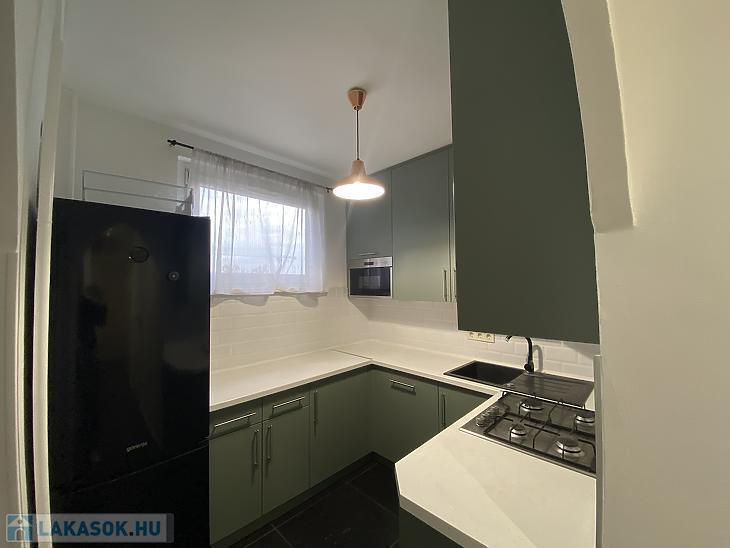 Konyhája ablakos, világos. A konyhabútor és a gépesítés a vételár részét képezi.