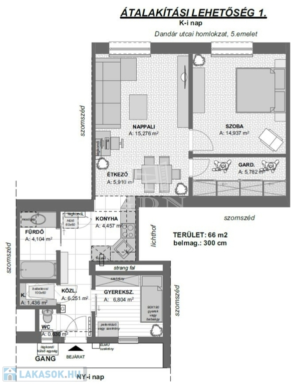 A lakás 2 tágas szobával rendelkezik, emellett található benne egy külön helyiség, amely jelenleg többféle funkciót is betölthet: lehet dolgozószoba, gardrób vagy akár étkező – a kialakítás teljes mértékben az új tulajdonos igényeihez igazítható. Ez a rugalmasság különösen vonzóvá teszi a lakást azok számára, akik szeretnék saját életstílusukra szabni otthonukat.