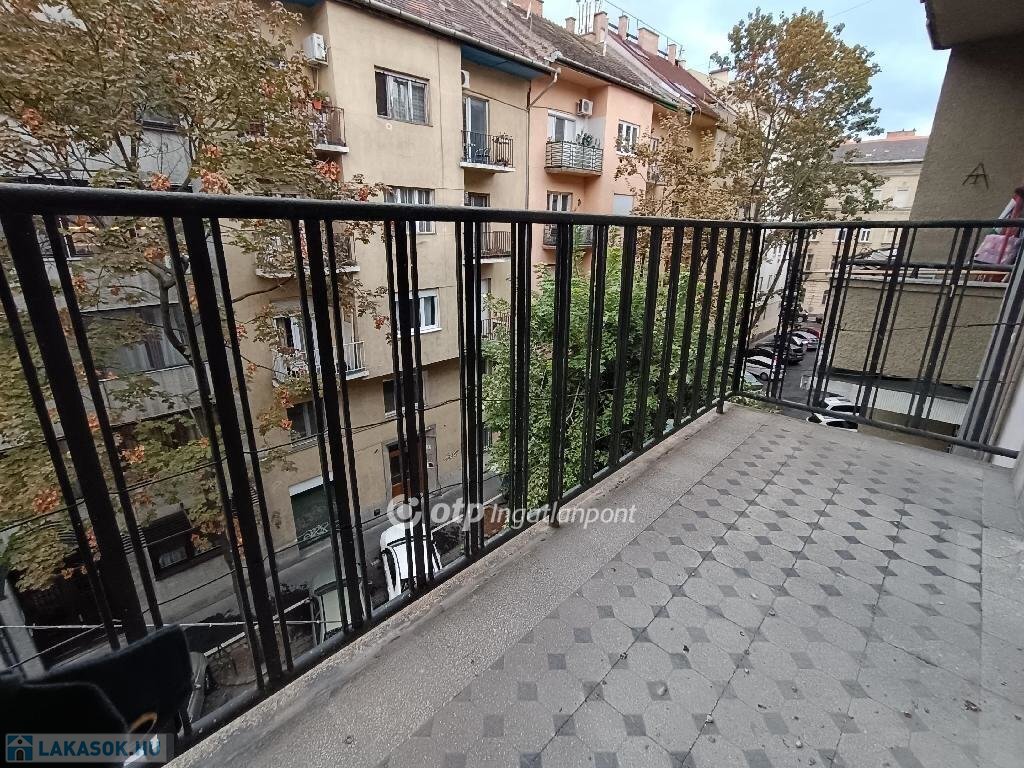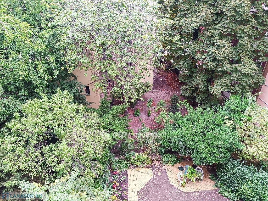 Konyhából nyíló 1,5 m2-es erkély zöld, fás belső udvarra néz