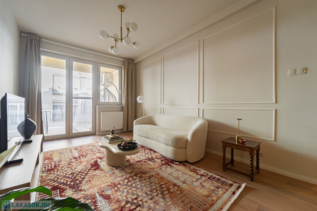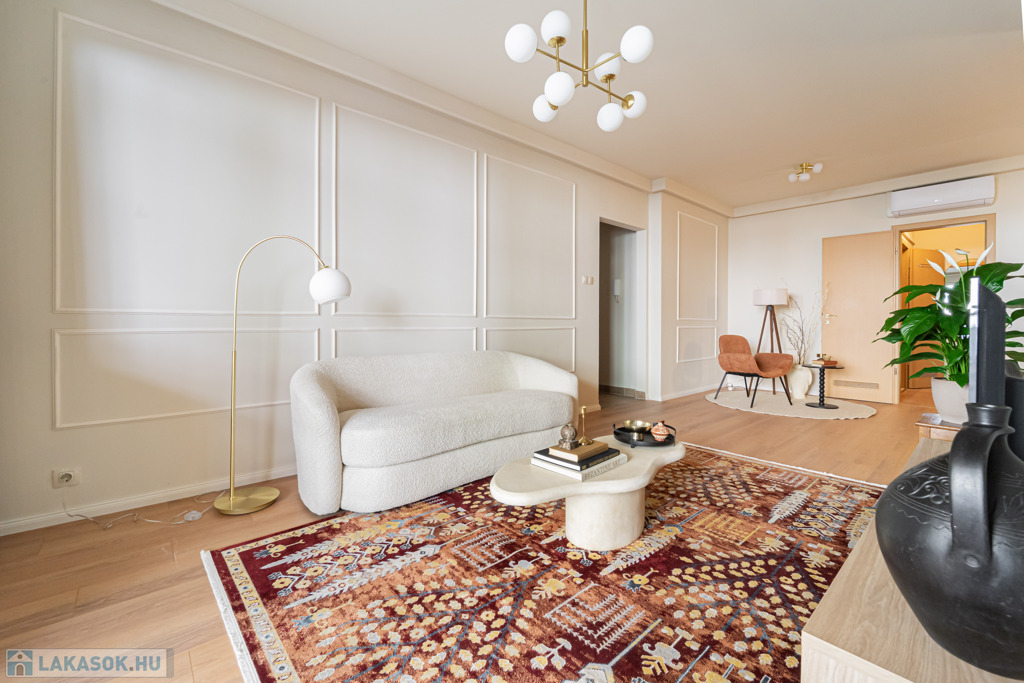 A liftes lakás a 2. emeleten helyezkedik el, utcára néző, keleti fekvésű, de mégis elég világos, légkondicionált. Az elmúlt hónapokban teljes körű felújításon esett át: új burkolatok, festés, designbútorok, valamint prémium gépesített konyha került kialakításra. A nappaliból nyílik a hatalmas, 14,5 m²-es loggia, amely kiválóan használható étkezésre, pihenésre, és akár be is építhető!