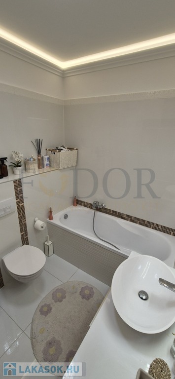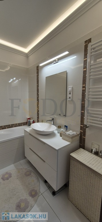 Az eredeti alaprajz szerint a lakás két fürdőszobával lett megtervezve, azonban a jelenlegi tulajdonosok a szülői hálószobához tartozó fürdőhelyiséget praktikus gardróbszobává alakították. A víz- és szennyvízkiállások azonban megmaradtak, így igény esetén a második fürdőszoba könnyedén visszaállítható.