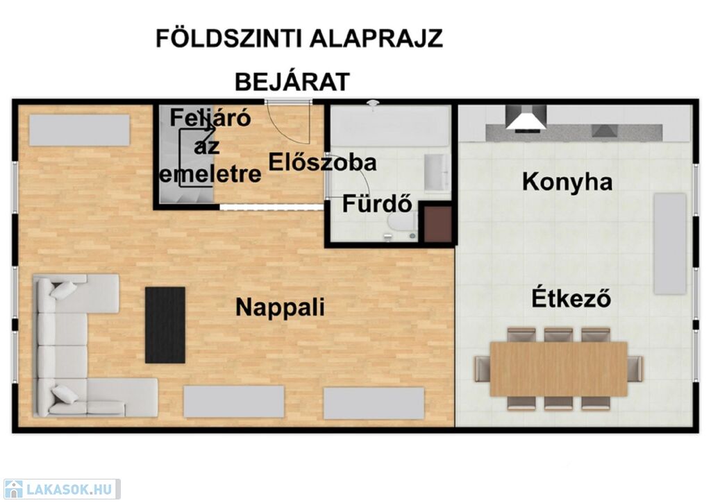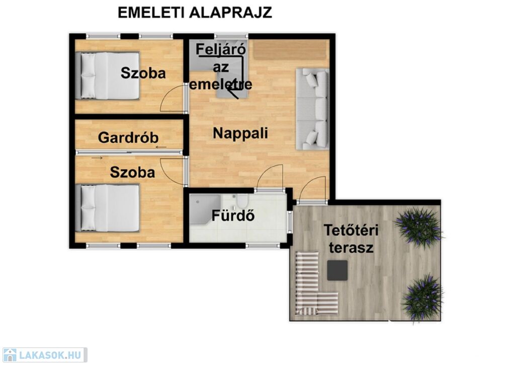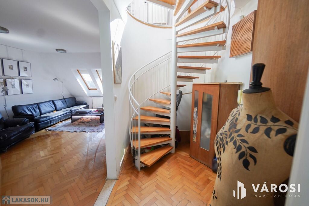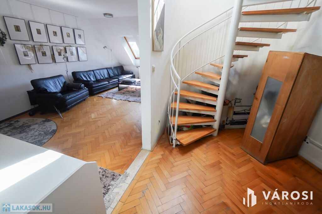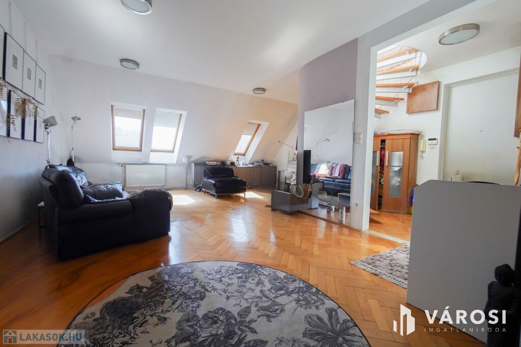 Ideális kialakítású a lakás mivel a hálószobák az emeleten helyezkednek el így lehetőséget biztosít a közel 60nm-es nappali a társasági életre!