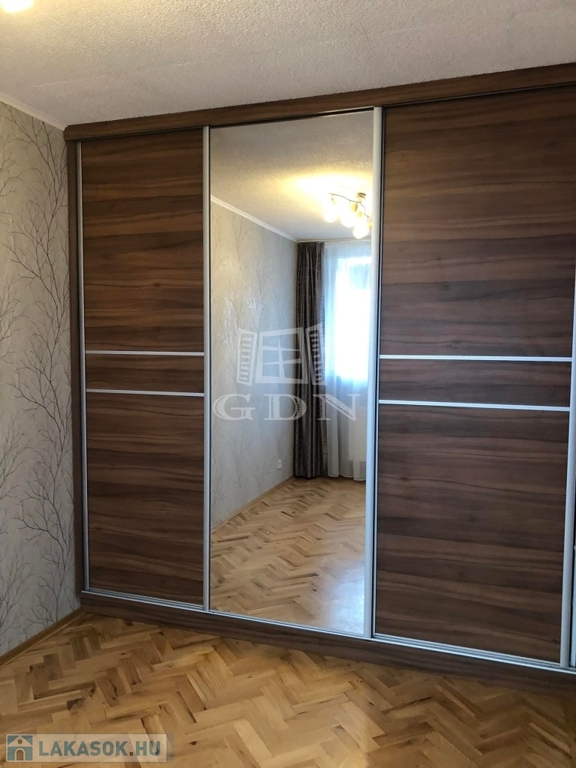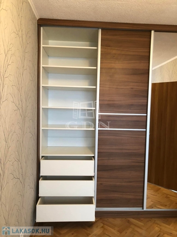 Az előszobában teljes hosszban beépített szekrény, a hálószobában három tolóajtós gardrób kapott helyet.