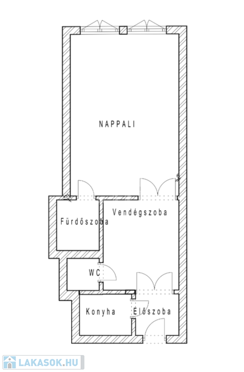 előszoba, hall, melyből egy szoba nyílik, étkező, konyha, fürdőszoba, vendég-WC.