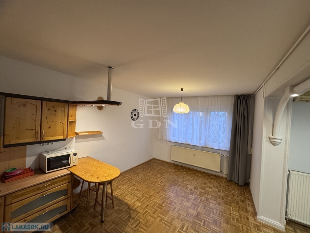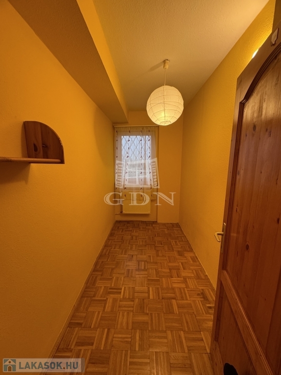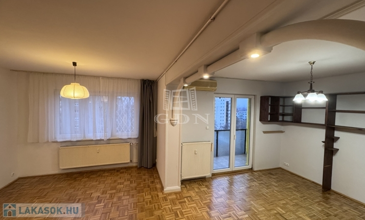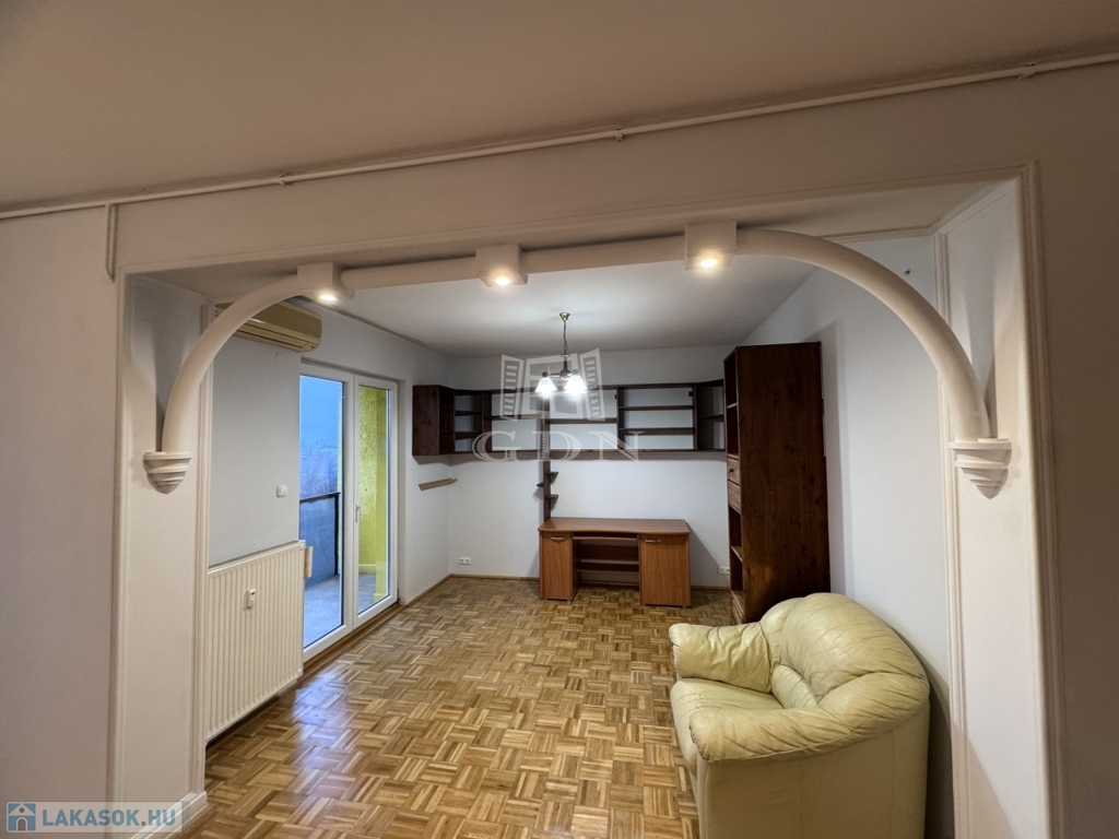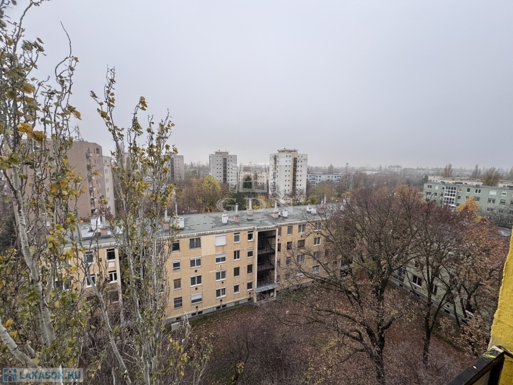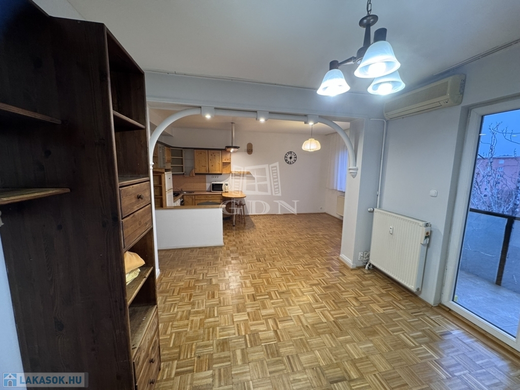 A lakás hetedik emeleti nyugalma felülről mutatja meg a város egyik legszebb arcát: fás, barátságos házak, a távolban a budai dombok – egy olyan panoráma, amitől minden nap jobb kedvvel indulsz el otthonról.