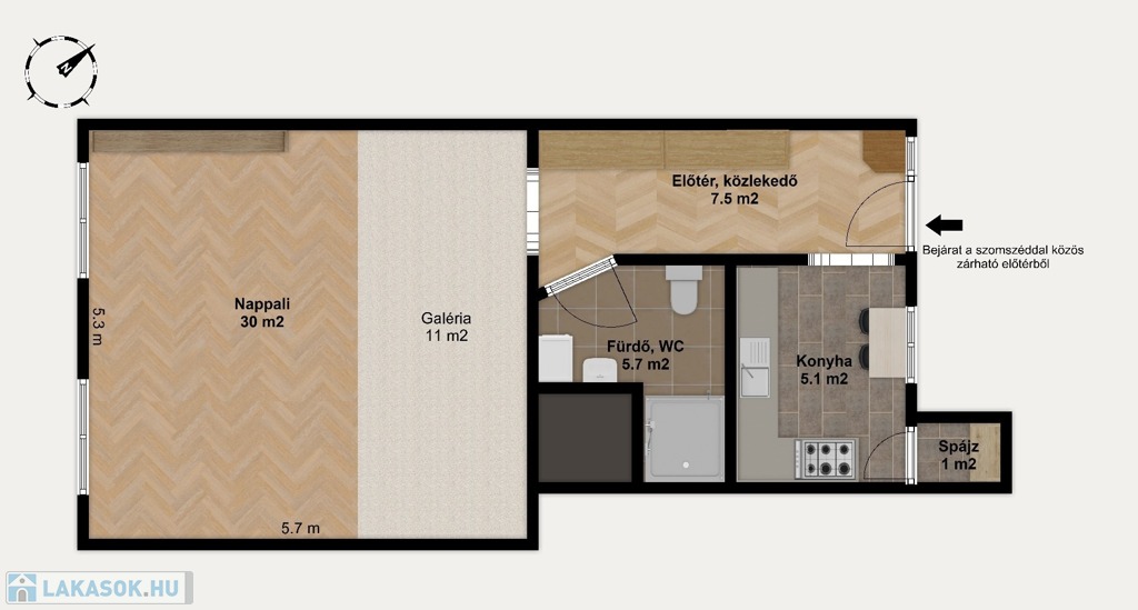 A közös költség 19000 Ft. A lakás előtt lévő, szomszéd ingatlannal közös terület külön is zárható. A gépesített konyha, a beépített szekrények és a jelenleg ott lévő, képeken látható bútorok is az ár részét képezik. A konyhából egy 1 m2-es spájz is nyílik, ugyancsak beszekrényezve és használatra készen.