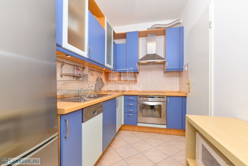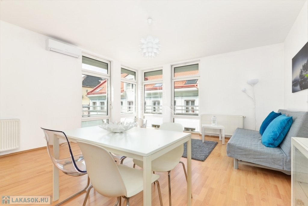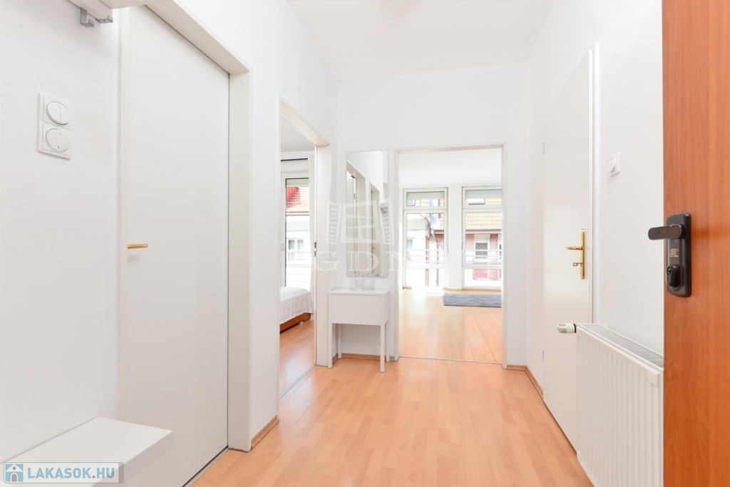 A lakás újszerű állapotú, gépesített, IKEA bútorokkal berendezett, légkondicionálóval felszerelt. Az 54 m2-es alapterület kiváló elosztású, fiatal pároknak vagy egyedül költözőknek is ideális. Az előszobából nyílik a tágas nappali, a konyha és a hálószoba, illetve külön fürdőszoba és WC került kialakításra.