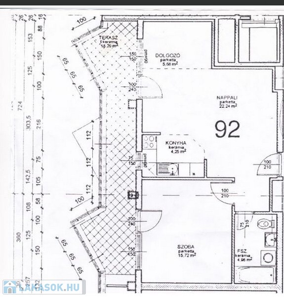 A konyha megrendelésre készített konyhabútorral van felszerelve, teljesen gépesített (hűtő, mosogatógép, kerámia főzőlap, sütő, mikró).