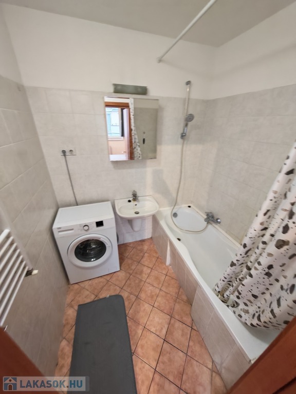 A fürdőszoba és a WC külön helységben van, a fürdőben mosógép.