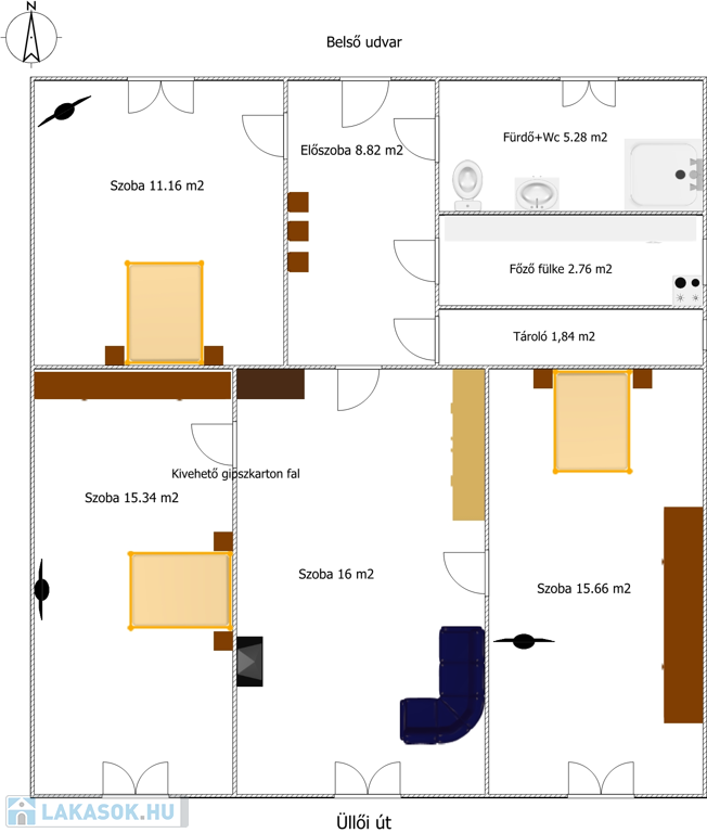 A szobák méretei: 1.szoba: 11.16m2,