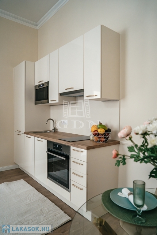 – A lakás konyhája teljesen gépesített (Bosch és Whirlpool márkák: sütő, főzőlap, hűtő, mosogatógép, mikrohullámú sütő, páraelszívó)