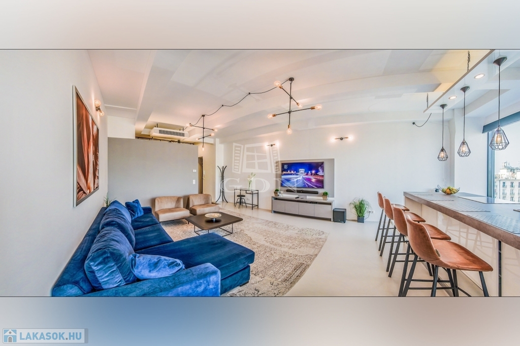 A hatodik emeleten további két eladó lakás egybenyitható, így akár egy 275 m²-es, panorámás ingatlan is kialakítható.