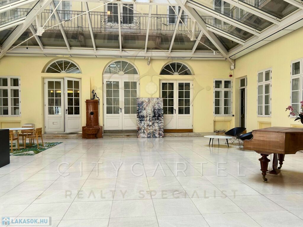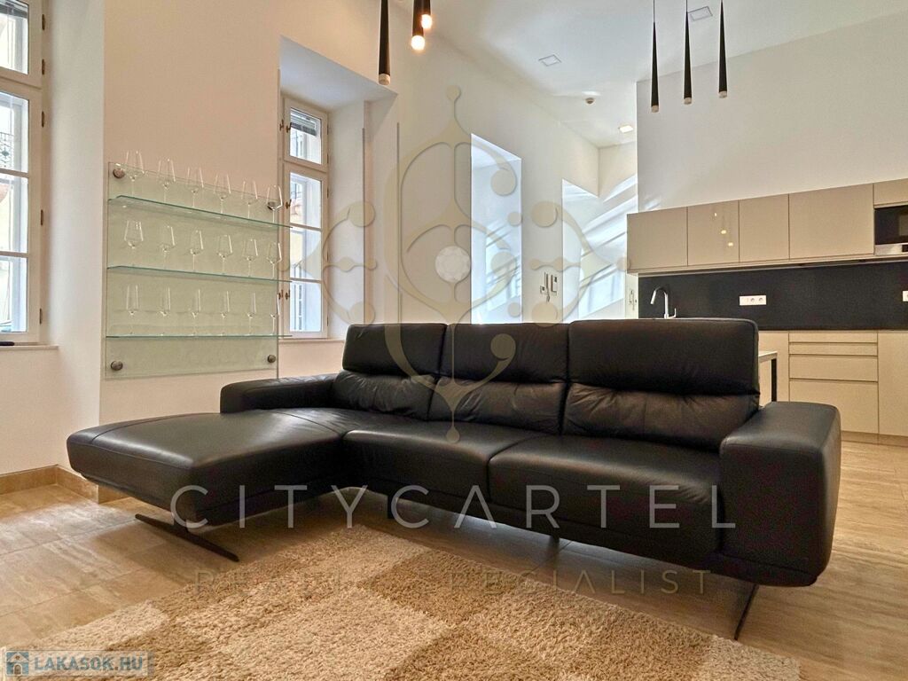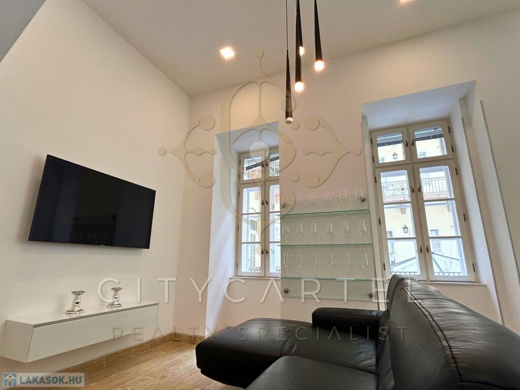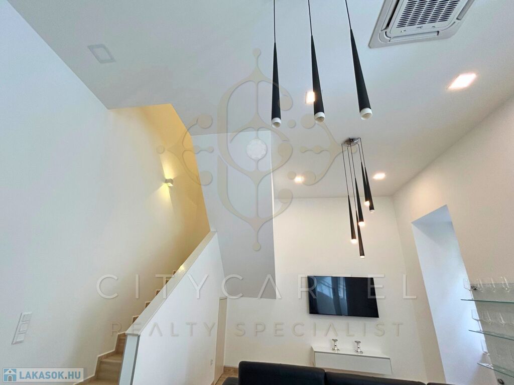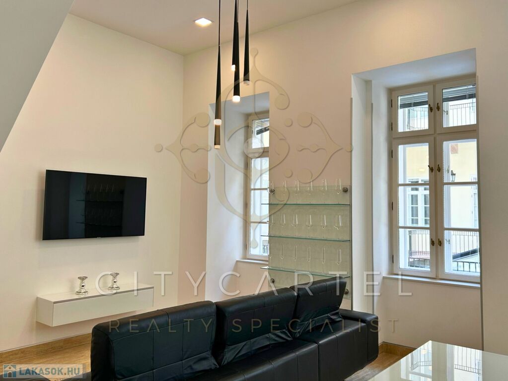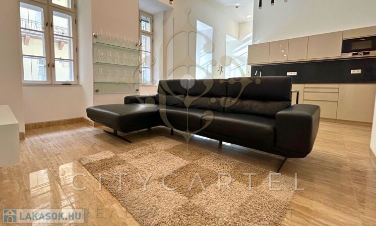 Az V. kerület egyik legnívósabb apartmanházában eladó egy 76 nm-es, belső kétszintes, amerikai konyhás nappali + 2 hálószobás, kiváló elosztású lakás, liftes épület 1. emeletén.