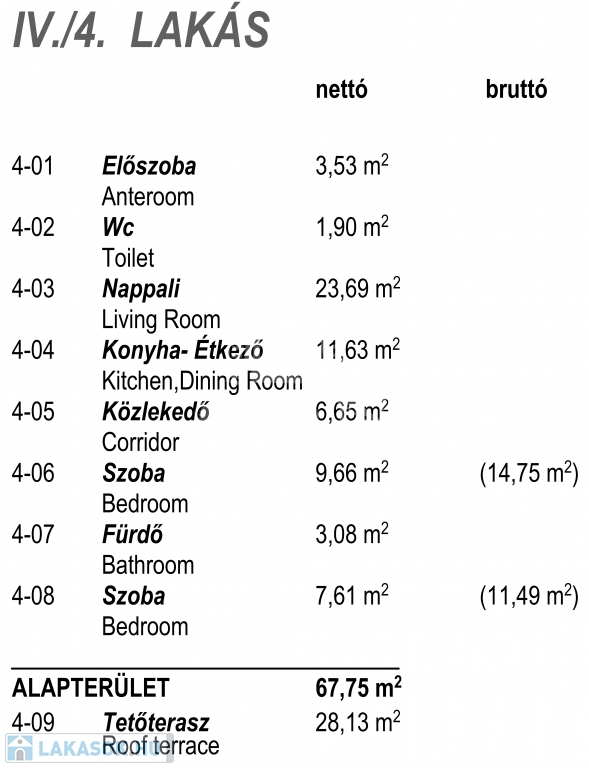 A 87m2-es értékesítési alapterület tartalmazza a nettó 68m2-es lakótéren felül 190cm alatti területek (9m2) és a terasz (28m2) területének 50%-át.