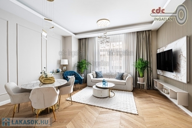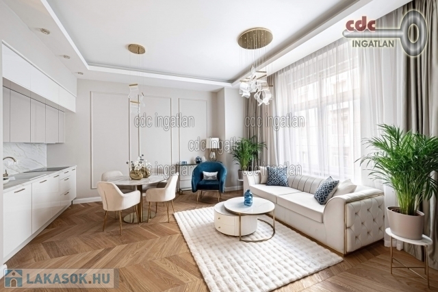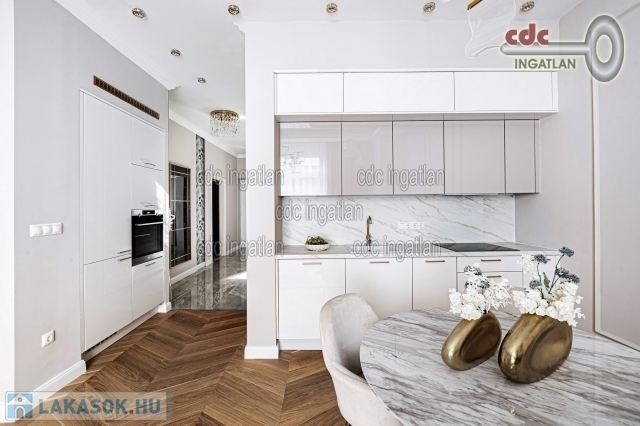 fő hálószobához egy elegáns káddal, WC-vel és bidével felszerelt fürdőszoba kapcsolódik, míg a második szobához egy modern zuhanyzós fürdő. Az ingatlan prémium minőségű bútorokkal és gépekkel együtt eladó, így az új tulajdonos azonnal beköltözhet egy teljesen felszerelt, exkluzív otthonba. A teljes körű felújítás során megtörtént a víz- és villanyvezetékek, valamint a fűtéscsövek, radiátorok cseréje. Designer csillárok, beépített szekrények, minőségi szaniterek és prémium burkolatok kerültek beszerelésre. A 3,30 méteres belmagasság és a chevron mintás tölgyfa parketta különleges, elegáns hangulatot kölcsönöz az otthonnak. A konyha teljesen gépesített, AEG márkájú készülékekkel felszerelt, mosogatógép, hűtő fagyasztóval, sütő, mikró, főzőlap, páraelszívó és mosógép is rendelkezésre áll. A lakás kényelmét két légkondicionáló és automata redőnyök, plusz sötétítők biztosítják. A fűtést házközponti rendszer biztosítja, a közös költség vízzel együtt 53.709.- Ft havonta. A társasház a klasszikus budapesti építészeti stílust képviseli. Az épület az 1900-as évek elején épült, és azóta számos felújításon esett át, megőrizve eredeti báját és eleganciáját. Az ingatlan, a lifttel felszerelt társasház 2. emeletén található a lépcsőházból nyílik a bejárati ajtó. A közvetlen közelben több busz- és villamosvonal elérhető, amelyek gyors és kényelmes kapcsolatot biztosítanak a város többi részével. Ez a lakás nem csak otthonként, hanem befektetésként is tökéletes választás azok számára, akik a belvárosi luxust és kényelmet keresik. Az ingatlan minden részlete a legmagasabb színvonalat