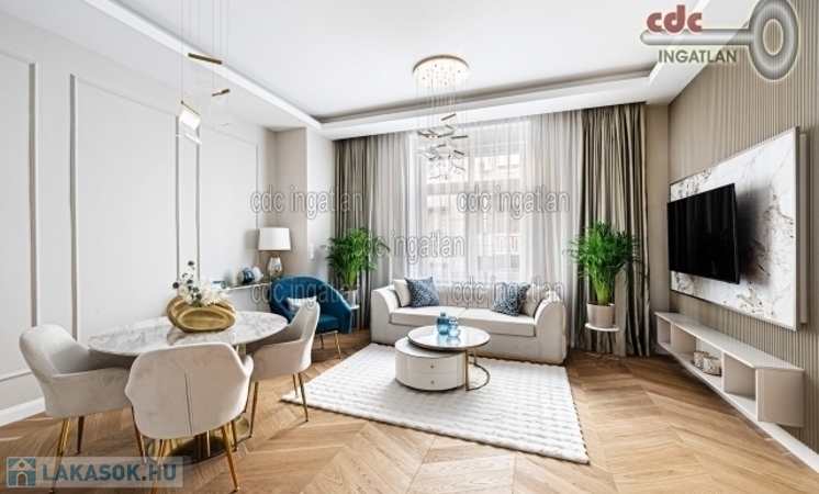 fő hálószobához egy elegáns káddal, WC-vel és bidével felszerelt fürdőszoba kapcsolódik, míg a második szobához egy modern zuhanyzós fürdő. Az ingatlan prémium minőségű bútorokkal és gépekkel együtt eladó, így az új tulajdonos azonnal beköltözhet egy teljesen felszerelt, exkluzív otthonba. A teljes körű felújítás során megtörtént a víz- és villanyvezetékek, valamint a fűtéscsövek, radiátorok cseréje. Designer csillárok, beépített szekrények, minőségi szaniterek és prémium burkolatok kerültek beszerelésre. A 3,30 méteres belmagasság és a chevron mintás tölgyfa parketta különleges, elegáns hangulatot kölcsönöz az otthonnak. A konyha teljesen gépesített, AEG márkájú készülékekkel felszerelt, mosogatógép, hűtő fagyasztóval, sütő, mikró, főzőlap, páraelszívó és mosógép is rendelkezésre áll. A lakás kényelmét két légkondicionáló és automata redőnyök, plusz sötétítők biztosítják. A fűtést házközponti rendszer biztosítja, a közös költség vízzel együtt 53.709.- Ft havonta. A társasház a klasszikus budapesti építészeti stílust képviseli. Az épület az 1900-as évek elején épült, és azóta számos felújításon esett át, megőrizve eredeti báját és eleganciáját. Az ingatlan, a lifttel felszerelt társasház 2. emeletén található a lépcsőházból nyílik a bejárati ajtó. A közvetlen közelben több busz- és villamosvonal elérhető, amelyek gyors és kényelmes kapcsolatot biztosítanak a város többi részével. Ez a lakás nem csak otthonként, hanem befektetésként is tökéletes választás azok számára, akik a belvárosi luxust és kényelmet keresik. Az ingatlan minden részlete a legmagasabb színvonalat