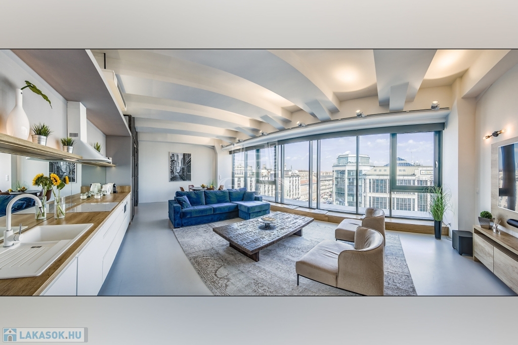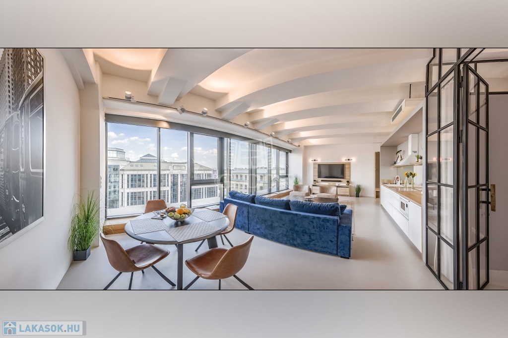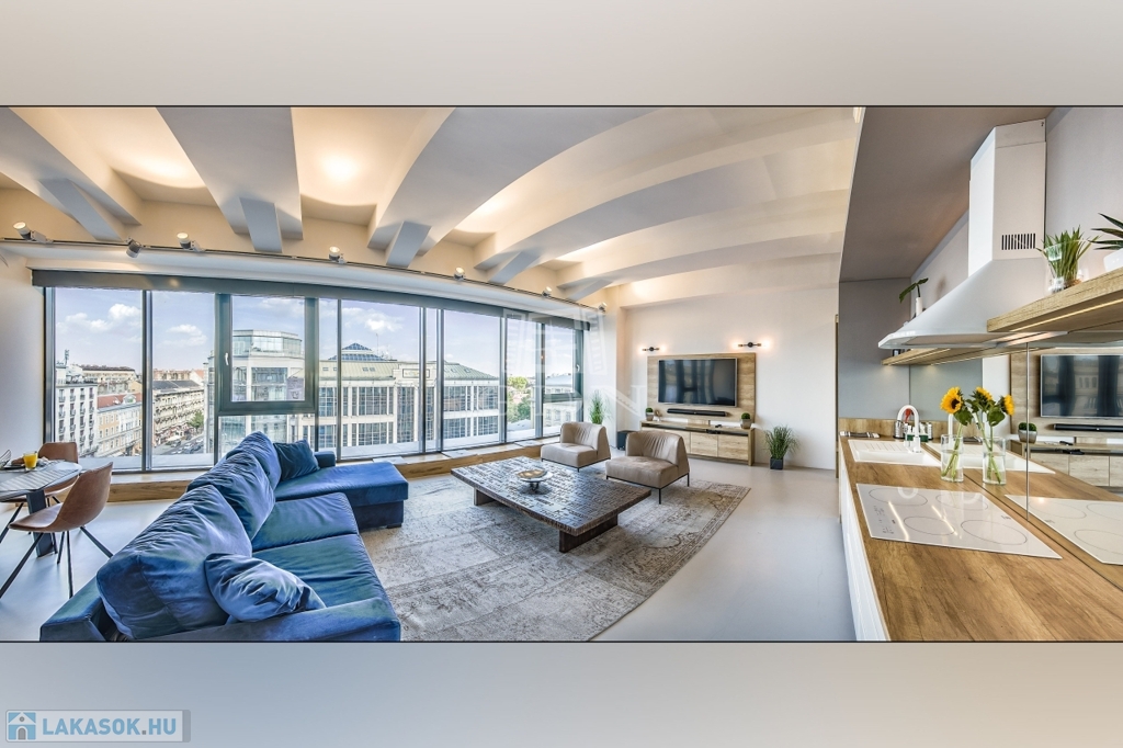 • Kilátás: a nappali a Múzeum körútra néz, közel 9 méter széles, padlótól mennyezetig érő üvegfelülettel
