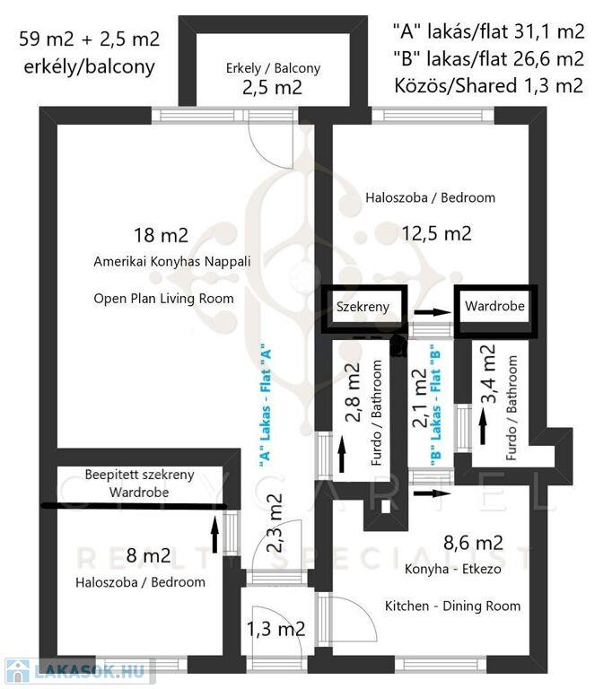 59 nm-es,Teljeskörűen Újraépítve | SMART rendszerrel felszerelve | Erkély | Két különálló lakásként vagy egy egységként is használható